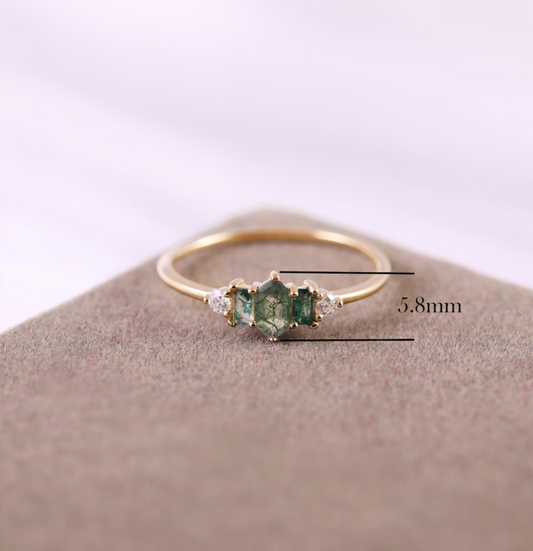 14K Solid Gold Moss Agate with Moissanite Ring, Solid Gold Hexagon Moss Agate Ring,Gold Gemstone Ring, Delicate Thin Band Ring,Gift for Her.