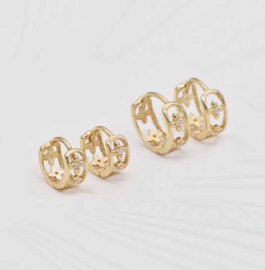10K Solid Gold flower huggie earrings, Solid Gold Clover hoop earrings