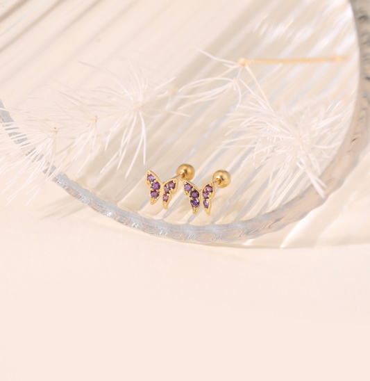 14K Solid Gold Tiny Amethyst Butterfly Stud Earring, Gold Cubic Zirconia Screw Ball Stud, Dainty Gemstone Butterfly Earlobe Cartilage Stud